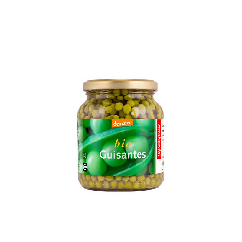 Guisantes ecológicos en tarro. Elaboración artesanal de productos procedentes de agricultura ecológica-dinámina. Producción con fuentes de energía natural. Electricidad limpia, energía solar, eólica e hidráulica.