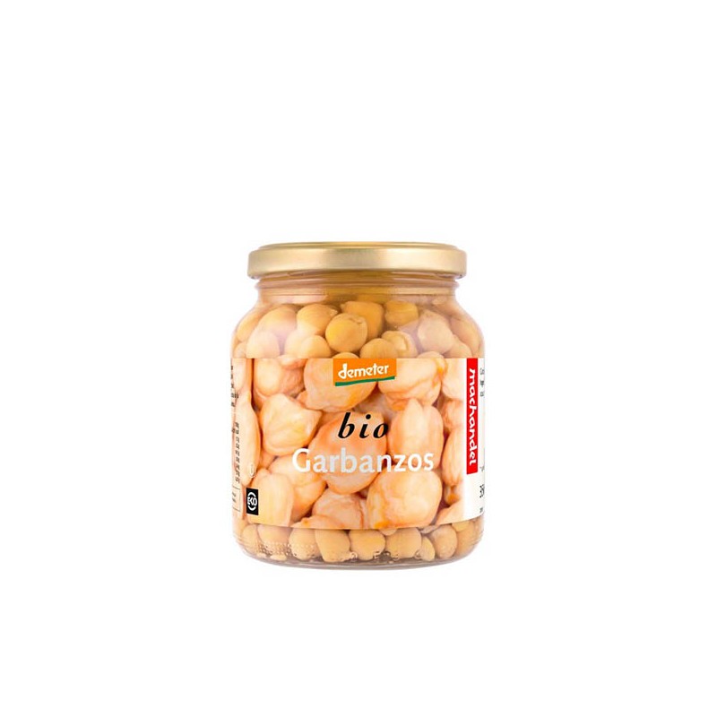 Garbanzos ecológicos en tarro. Elaboración artesanal de productos procedentes de agricultura ecológica-dinámina. Produción con fuentes de energía natural. Electricidad limpia, energía solar, eólica e hidráulica.
