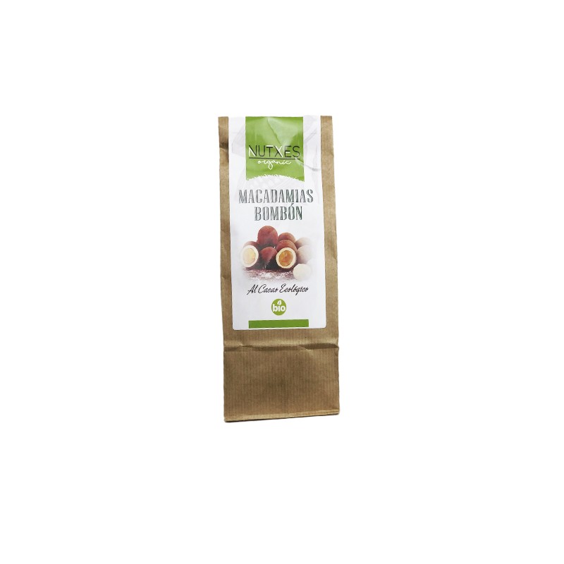 Nueces de macadamia ecológicas cubiertas con chocolate blanco y espolvoreadas con cacao en polvo.