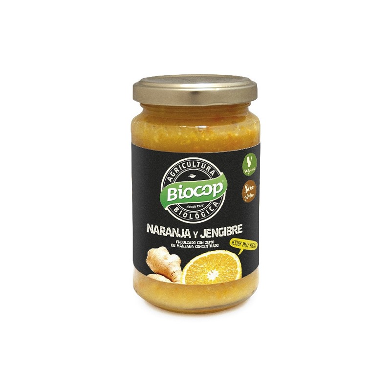 Compota de naranja con jengibre. Elaborada con naranjas maduras mediante cocción mínima para garantizar todo el sabor y aroma de la fruta. Endulzado con concentrado de zumo de manzana.