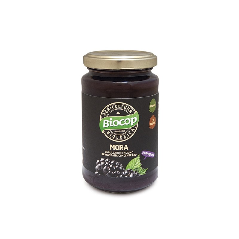 Compota de mora. Elaborada con moras maduras mediante cocción mínima para garantizar todo el sabor y aroma de la fruta. Endulzado con concentrado de zumo de manzana.