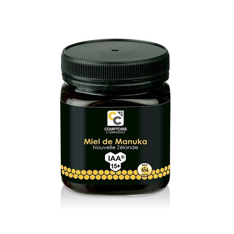 Miel de Manuka con un índice IAA15+. Esta miel tiene un nivel mínimo de metilglioxal de 514 mg / kg. Producida en Nueva Zelanda.