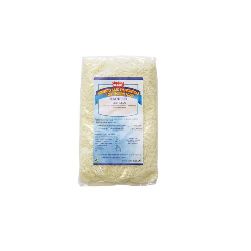 Deliciosa pasta italiana, con bajo contenido en proteínas y fenilalanina, especialmente indicada para preparar suculentos platos italianos, ensaladas, sopas, etc., en dietas especiales hipoproteicas, como la insuficiencia renal o las enfermedades producidas por errores congénitos del metabolismo de los aminoácidos (fenilcetonuria). Apto para fenilcetonuricos.