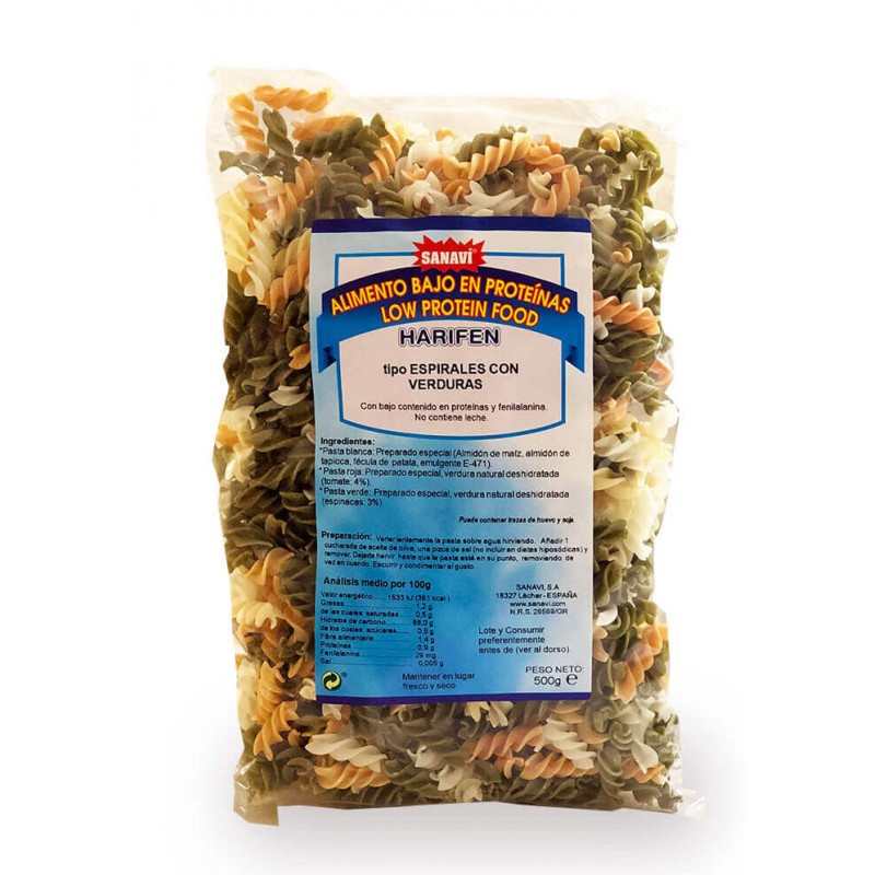 Deliciosa pasta con verduras (tomate y espinacas) con un bajo contenido en proteínas y fenilalanina. Especialmente indicada para preparar exquisitos platos en dietas hipoproteícas, como la insuficiencia renal o las enfermedades producidas por errores congénitos del metabolismo de los aminoácidos (fenilcetonuria). Apto para fenilcetonuricos.