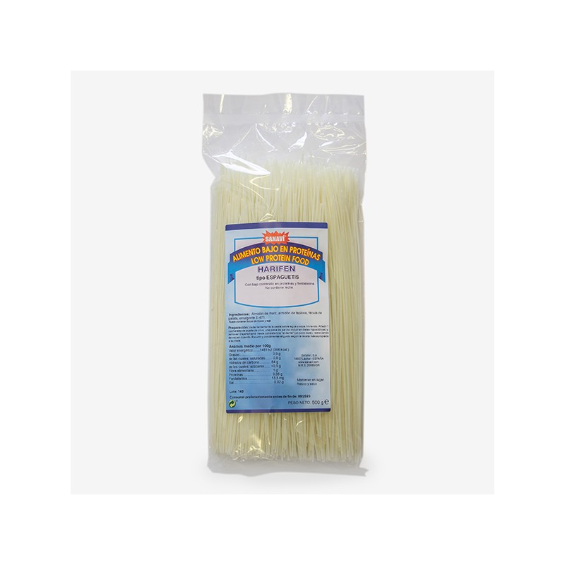 Con bajo contenido en sal, potasio y fósforo.Composición de Espaguetis Harifen 500gr