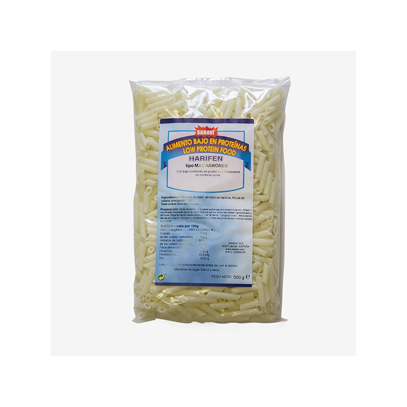 Deliciosos macarrones, con bajo contenido en proteínas y fenilalanina, especialmente indicada en dietas especiales hipoproteicas, como la insuficiencia renal o las enfermedades producidas por errores congénitos del metabolismo de los aminoácidos (fenilcetonuria). Apto para fenilcetonuricos.