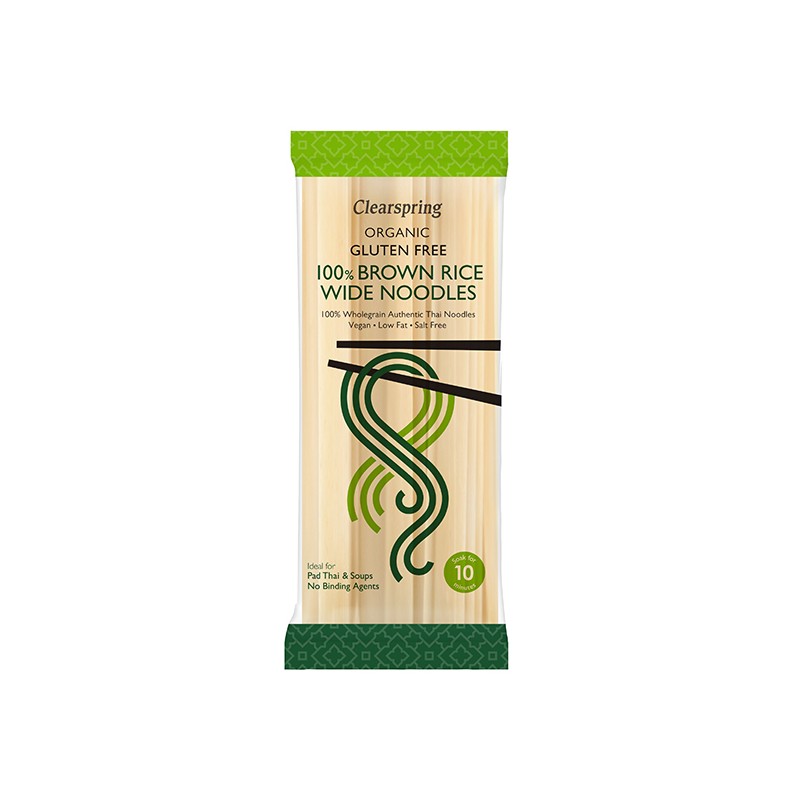 Fideos ecológicos de arroz integral sin gluten. Producto de TailandiaFáciles de cocinar, que añaden un auténtico toque oriental a cualquier plato. La más alta calidad de arroz integral orgánico y procesos tradicionales se utilizan para producir estos fideos integrales sin gluten. Rehogue con verduras y salsa de pasta Tailandesa para elaborar unos deliciosos tallarines asiáticos, ensaladas, o añadirlos a sopas para una comida rápida y satisfactoria. También se pueden utilizar como una alternativa a la pasta libre de gluten.
