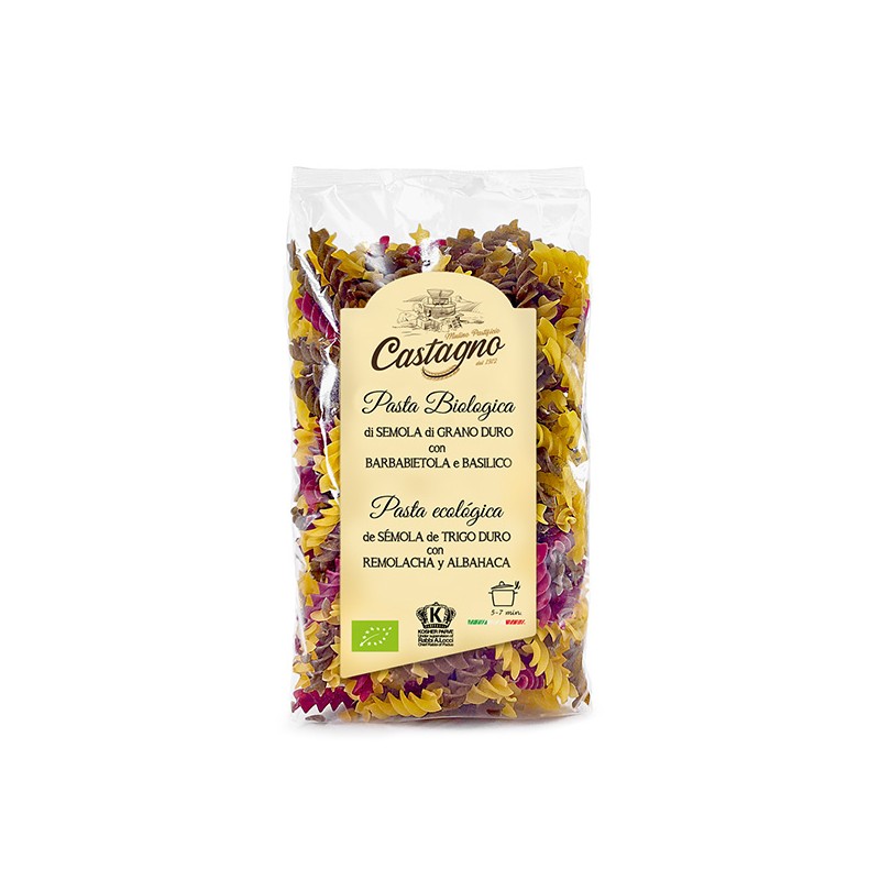 Espirales tricolor de Trigo con Tomate, Albahaca y Remolacha, elaboradas con ingredientes procedentes de agricultura ecológica.