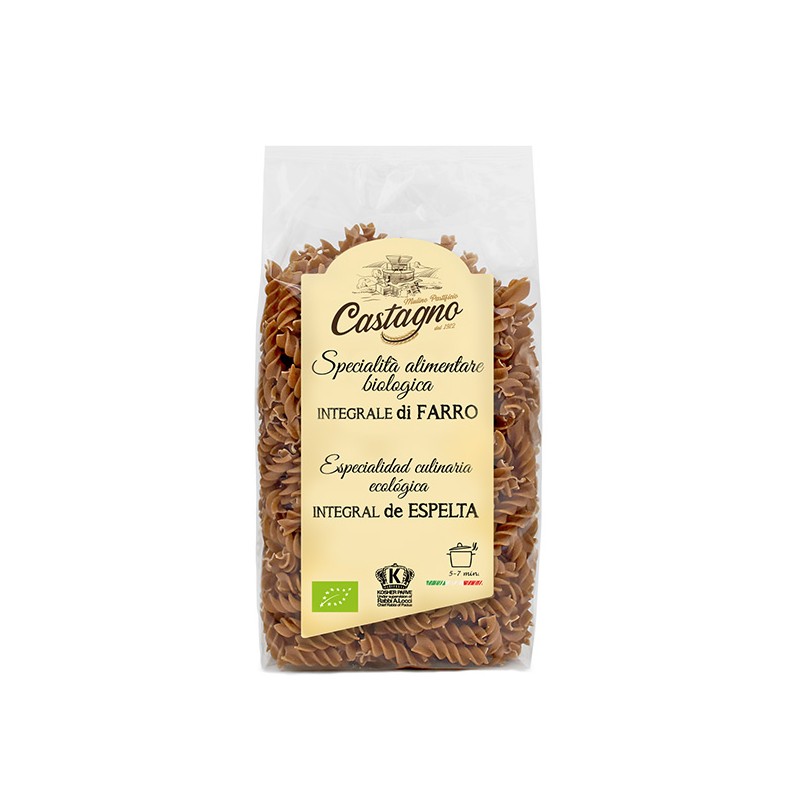 Espirales integrales de Espelta elaboradas con ingredientes procedentes de agricultura ecológica.