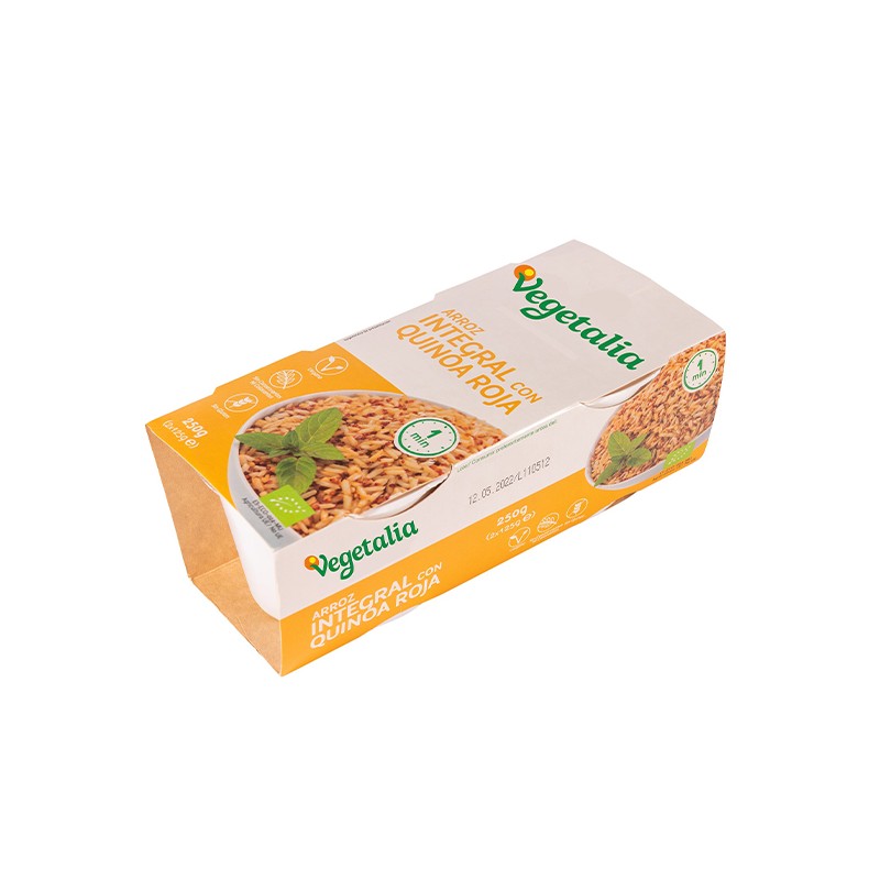 Arroz integral cocido* (86%) (arroz integral*, agua), quinoa roja cocida* (8,5%) (agua, quinoa*), aceite de girasol*, lecitina de girasol* (emulgente), sal. (*de agricultura ecológica).