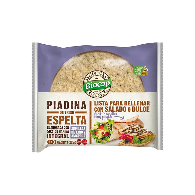3 Piadinas elaboradas con mezcla de harinas integral y blanca de trigo espelta y semillas de lino y de amapola Ideal prepararla en sartén y rellenarla con ingredientes dulces o bien salados Elaborada con aceite de oliva virgen extra No contiene leche no derivados. Apto para veganos