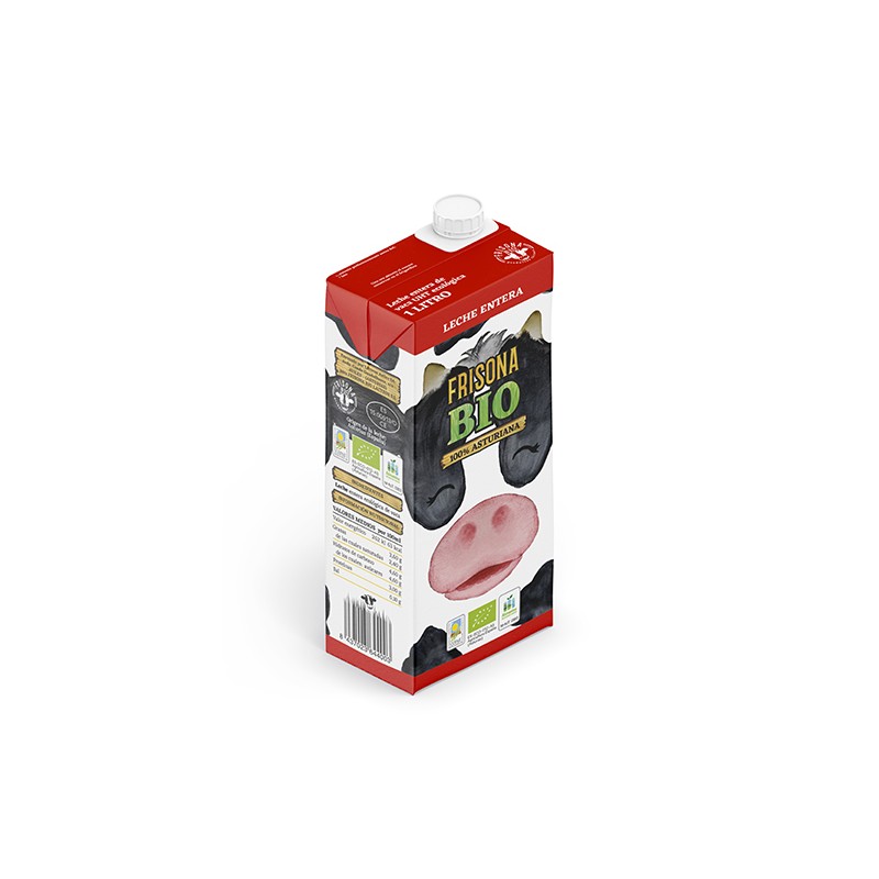 Leche ecológica entera sometida a tratamiento UHT y envasado aséptico. 100% leche Asturiana.
