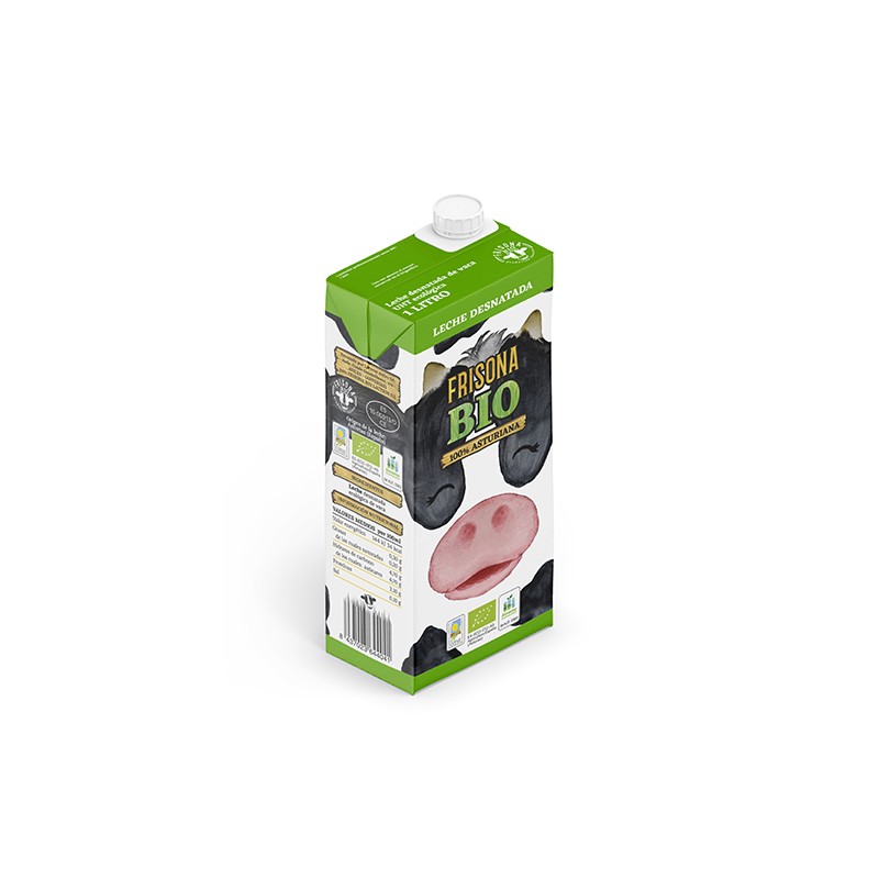 Leche ecológica desnatada sometida a tratamiento UHT y envasado aséptico. 100% leche Asturiana.