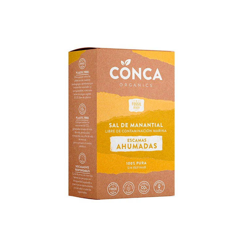 Escamas de sal fósil sin refinar libre de monoplásticos, harina de arroz* (3%) y humo. *Procedente de agricultura ecológica
