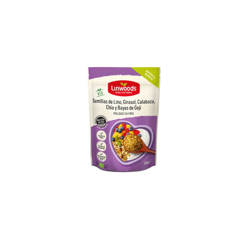 Linwoods. Semillas de lino, girasol, calabaza, chía (Salvia hispánica) y bayas de Goji molidas en frío y biológicas.