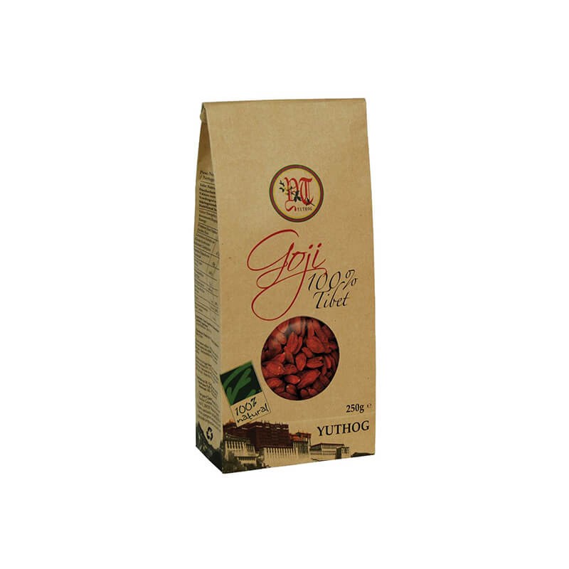 La Baya del Goji Yuthog pertenece a la variedad Lycium barbarum. Es una fruta desecada, de color rojo intenso, similar en textura y tamaño a las pasas, pero con un sabor característico: dulce con tonos ácidos. Yuthog, la empresa ubicada en Lhasa (Tibet) y controlada por el Colegio Médico Tibetano, recolecta sus bayas de forma artesanal en la Meseta Tibetana. Tan importante como la procedencia de las bayas es el cuidado con el que se desecan y conservan. Los procesos seguidos por estos maestros de la medicina tibetana hacen posible que sus bayas no tengan igual. El sabor, textura y pureza del producto final son inigualables.