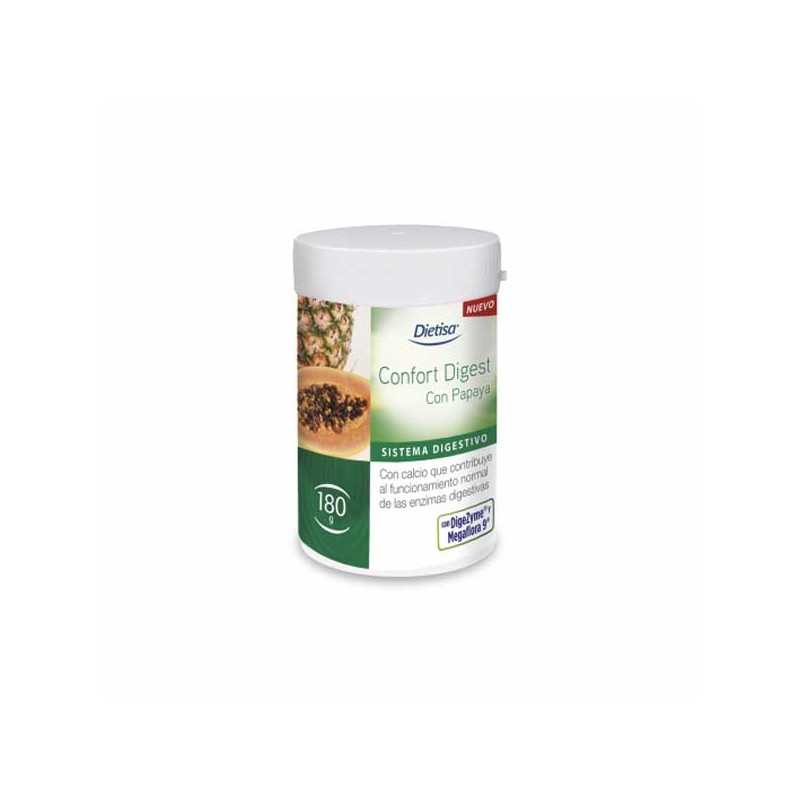 Confort Digest con papaya de Dietisa es un complemento alimenticio a base de papaya, piña, digezyme y megaflora 9 (lactococos, lactobacilos, bifidobacterias y enterococos), componentes de la flora intestinal normal. Además contiene calcio que contribuye al funcionamiento normal de las enzimas digestivas.