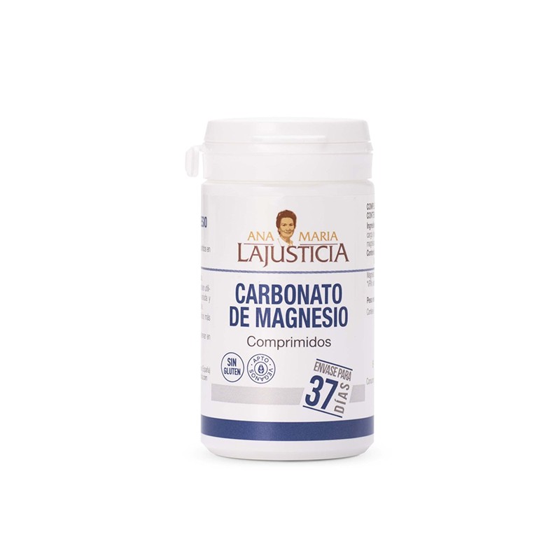El magnesio ayuda a disminuir el cansancio y la fatiga. El magnesio contribuye al equilibrio electrolítico, al metabolismo energético normal y al funcionamiento normal del sistema nervioso y de los músculos. Además, el magnesio contribuye a la síntesis proteica normal, a la función psicológica normal y al mantenimiento de los huesos y dientes en condiciones normales. También contribuye al proceso de división celular. PH alcalino/neutro. Efecto laxante medio.Composición de Carbonato de magnesio 75 comprimidos