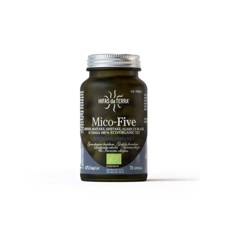 Suplemento ECO apto para celiacos e intolerantes a la lactosa, vegetarianos y veganos. Los productos de Hifas no contienen metales pesados ni pesticidas.Composición de Mico Five (Inmuno HDT) 70 Caps.