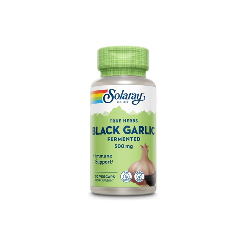 Complemento alimenticio a base de ajo negro fermentado. El ajo negro fermentado es el resultado de un proceso de fermentación enzimática del ajo común, que cambia de color de blanco a negro. Después se deja envejecer durante 90 días y se liofiliza. El origen del ajo del producto Black Garlic de Solaray® es norteamericano y la fermentación se realiza en Wisconsin.