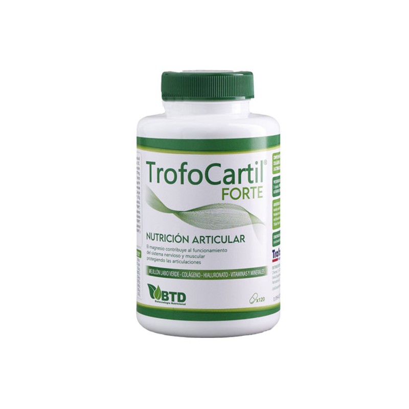 El agente activo de TrofoCartil FORTE es el extracto de Perna canaliculus (Mejillón de Labio Verde de Nueva Zelanda), que junto a otras sustancias orgánicas e inorgánicas como colágeno marino hidrolizado, glucosaminoglicanos y mucopolisacáridos, fitomoduladores, vitaminas y minerales, garantizan una alta asimilación de las sustancias que lo integran con unos resultados excepcionales para mejorar la estructura articular y la integridad del cartílago mejorando la movilidad de las articulaciones. Nuestro extracto de Mejillón de Labio Verde (Perna canaliculus) se extrae de granjas especializadas en Nueva Zelanda con control de calidad y propiedad de laboratorios alemanes y holandeses, donde a través de crías de cultivos y cosechas en condiciones óptimas se extraen únicamente moluscos de una determinada edad, tamaño y estado madurativo de sus gónadas que a través de minuciosos análisis y estrictos controles de calidad, certifican un contenido en mucopolisacáridos (glucosamina y condroitin 4 y 6 sulfatados) de alta calidad y de origen totalmente natural. Ahora más reforzado con la aportación de la planta Uncaria tomentosa (Uña de gato) ACCIONES: Fomenta la formación de tejido conectivo, tendones, ligamentos, cápsulas y cartílagos. Aporta sustancias y elementos vitales que integran la matriz del cartílago. Aumenta la producción de colágeno y por lo tanto fortalece el tejido conectivo (debilidad de ligamentos, cápsulas articulares y tendones) Mantiene la elasticidad de los tejidos (dada su gran capacidad hidrófila), ejerciendo una positiva condroprotección. Estimula la biosíntesis de condrocitos y sinoviocitos de tipo B Inhibe la destrucción enzimática del cartílago. Potencia la formación de los proteoglicanos. Retrasa los procesos degenerativos del cartílago. Garantiza una mayor y mejor absorción intestinal. Favorece la integridad de los componentes del cartílago por su marcada acción antioxidante, aún después de varios meses de terminar su ingesta. Efectos antiinflamatorios y analgésicos. Obtiene flexibilidad, elasticidad y movilidad articular. Disminuye notoriamente aquellos síntomas de desgaste del aparato locomotor relacionados con la edad y con el deporte. Consigue una mejor salud de las articulaciones y una mayor calidad de vida en artrosis, osteoartritis, artritis, rigidez de las articulaciones, lesiones articulares, inflamaciones de tendones y ligamentosComposición de Trofocartil Forte 120 cápsulas