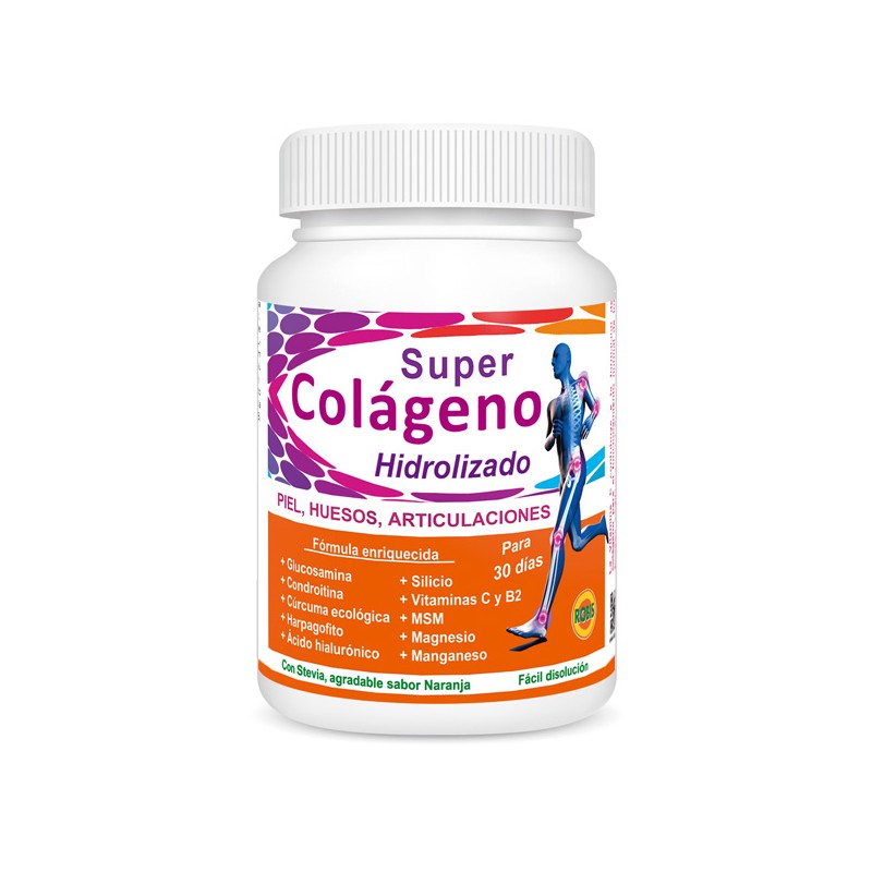 Por dosis diaria de 10 g: Colágeno hidrolizado 7.000 mg, maltodextrina, carbonato magnésico (185 mg de magnesio), aroma de naranja, D-glucosamina sulfato (contiene crustáceos) 324 mg, MSM (metilsulfonilmetano) 267 mg, cúrcuma polvo ecológica (Curcuma longa Vahl.) 100 mg, corrector de acidez (ácido cítrico monohidratado), vitamina C (ácido L-ascórbico) 80 mg, extracto seco de harpagofito (Harpagophytum procumbens DC 2% harpagósidos) 60 mg, extracto seco de Bambú (Bambusa arundinacea (Retz.) Willd.70% silicio) (aporta 24 mg de silicio), condroitín sulfato (contiene pescado y derivados) 33 mg, ácido hialurónico 6 mg, edulcorante (glicósidos de esteviol destinado a la alimentación), sulfato de manganeso (aporta 2,7 mg de manganeso), vitamina B2 (riboflavina) 1,4 mg.
