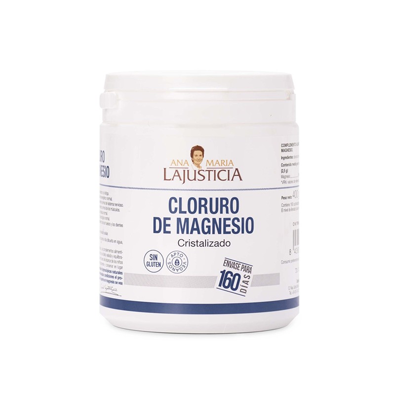 El magnesio ayuda a disminuir el cansancio y la fatiga. El magnesio contribuye al equilibrio electrolítico, al metabolismo energético normal y al funcionamiento normal del sistema nervioso y de los músculos. Además, el magnesio contribuye a la síntesis proteica normal, a la función psicológica normal y al mantenimiento de los huesos y dientes en condiciones normales. También contribuye al proceso de división celular. Efecto laxante alto.Composición de Cloruro de magnesio cristalizado 400 gr