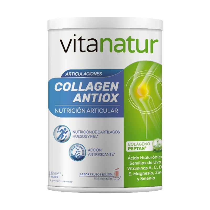 Vitanatur Collagen Antiox es un complemento alimenticio a base de colágeno hidrolizado, ácido hialurónico, extracto de semillas de uva, vitaminas A,C,D y E, magnesio, selenio y zinc.