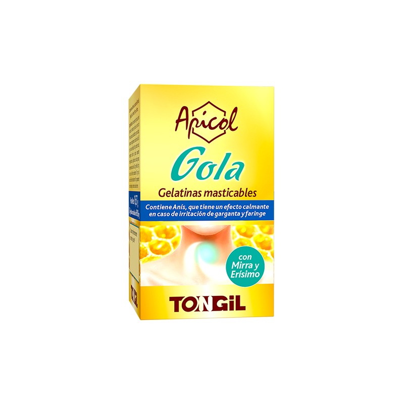 Los Aceites esenciales de Anís y Menta tienen un efecto suavizante sobre garganta, faringe y cuerdas vocales. El Regaliz suaviza el tracto respiratorio superior y ayuda a mantener las vías respiratorias despejadas. La Mirra tiene un efecto beneficioso sobre el tracto respiratorio. El Erísimo suaviza la garganta en caso de irritación.Composición de Apicol Gola 24 gelatinas masticables