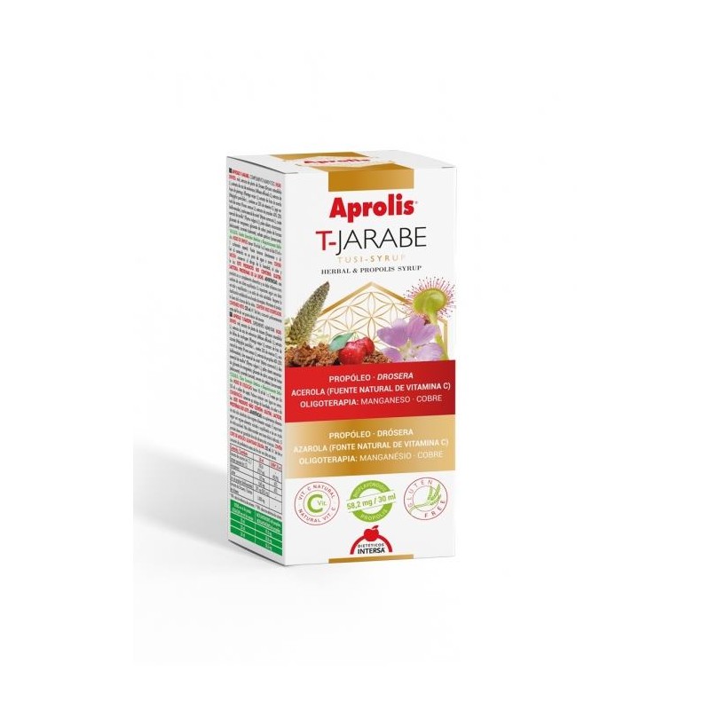 Miel, extractos de: Drosera (Drosera rotundifolia L.), Malvavisco (Althaea officinalis L.), Plantago (Plantago major L.), Acerola (Malpighia punicifolia L.), contiene un 25% de vitamina C, Jugo natural de cereza (Prunus cerasus L.), extracto de propóleo 40%. aceites esenciales de: Mirto (Myrtus communis L.), Tomillo (Thymus vulgaris L.), Polen abierto micronizado, Gluconato de manganeso, gluconato de cobre. Excipientes: jarabe de fructosa (edulcorante), sorbato potásico (conservante)