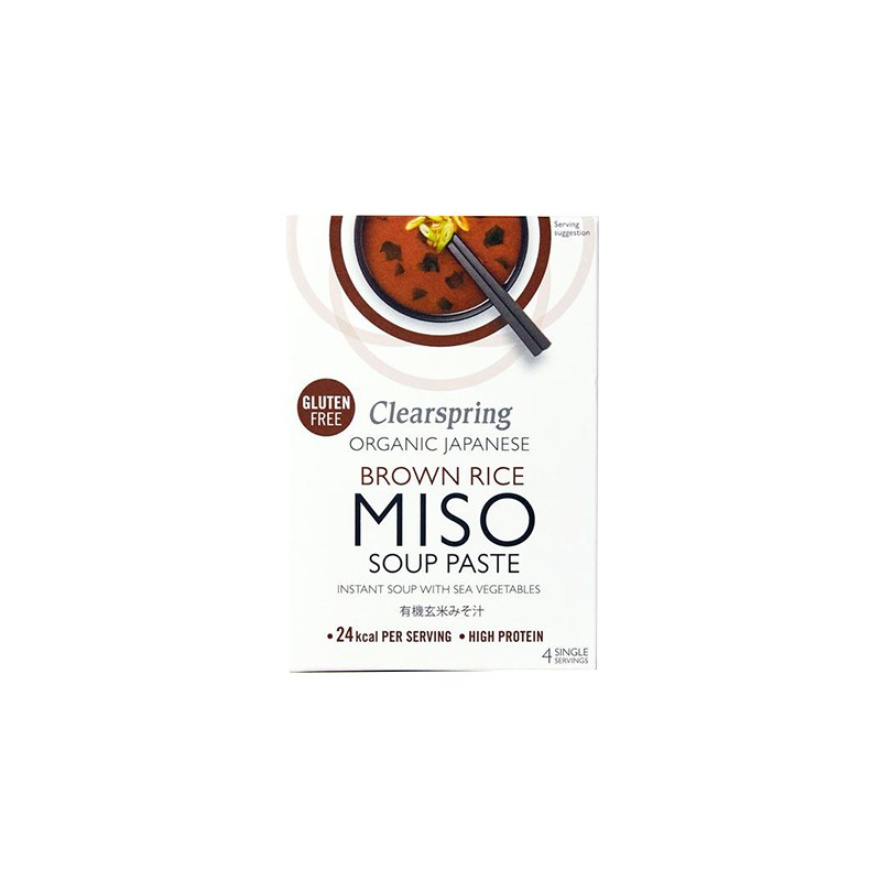 Miso de arroz integral* (70%) ( soja entera *, arroz integral cultivado*, sal marina, agua), mirin* (arroz dulce*, shochu* [agua, arroz cultivado*], arroz cultivado*), agua, sal marina, puré de cebolla*, alga wakame (1%), extracto de alga kombu (1%) (agua, kombu, sal marina). *de cultivo orgánico.