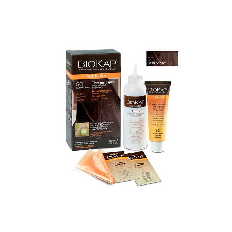 Biokap Nutricolor tinte del pelo es un valioso aliado para la belleza y la coloración del cabello. Su exclusiva fórmula con ingredientes vegetales y alta tolerabilidad de la piel nutre y repara el cabello mientras lo tiñe y cubre perfectamente las canas. Con TRICOREPAIR, un complejo con proteínas del arroz, derivados del sauce y ácidos frutales lipofílicos. Enriquecido con aceite de argán de origen orgánico, nutre el cabello y hace que sea más suave y brillante.