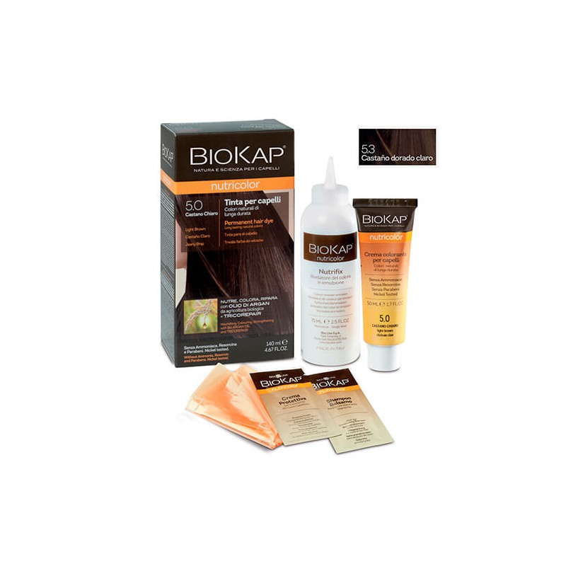 Biokap Nutricolor tinte del pelo es un valioso aliado para la belleza y la coloración del cabello. Su exclusiva fórmula con ingredientes vegetales y alta tolerabilidad de la piel nutre y repara el cabello mientras lo tiñe y cubre perfectamente las canas. Con TRICOREPAIR, un complejo con proteínas del arroz, derivados del sauce y ácidos frutales lipofílicos. Enriquecido con aceite de argán de origen orgánico, nutre el cabello y hace que sea más suave y brillante.