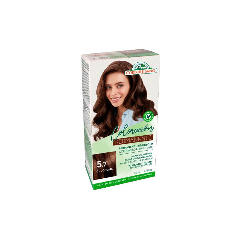 Tinte Chocolate (5.7) de Corpore Sano gracias a este nueva línea se consigue máxima cobertura, color intenso y radiante, larga duración, protección del color y máximo cuidado.