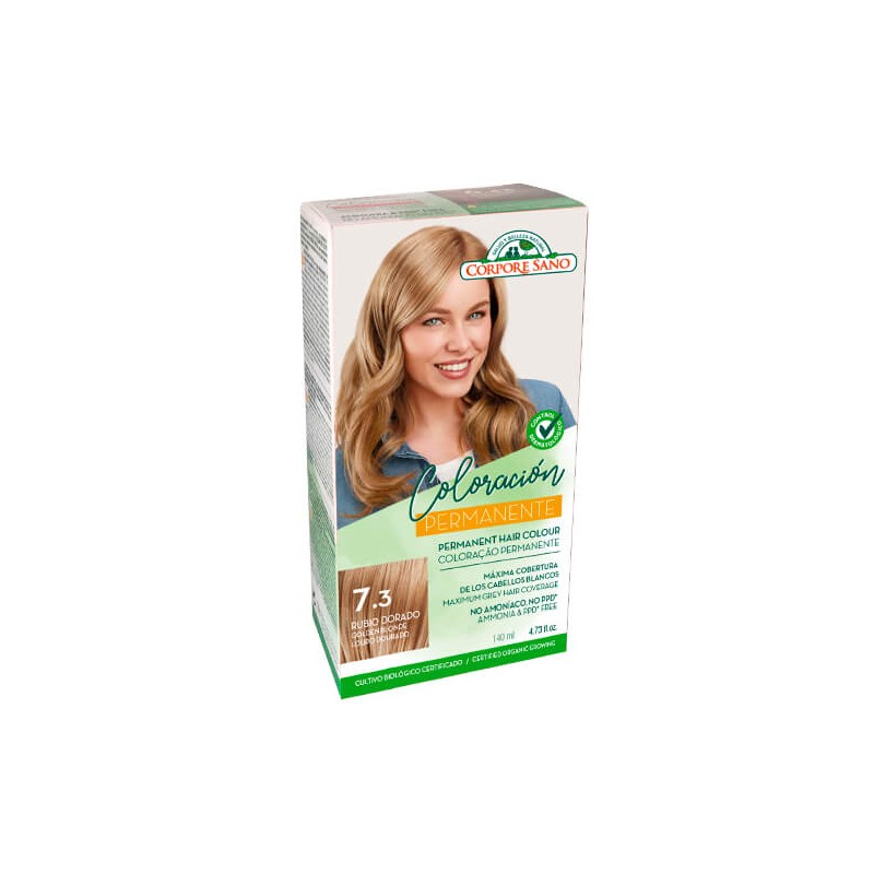 Tinte Rubio Dorado (7.3) de Corpore Sano gracias a este nueva línea se consigue máxima cobertura, color intenso y radiante, larga duración, protección del color y máximo cuidado.