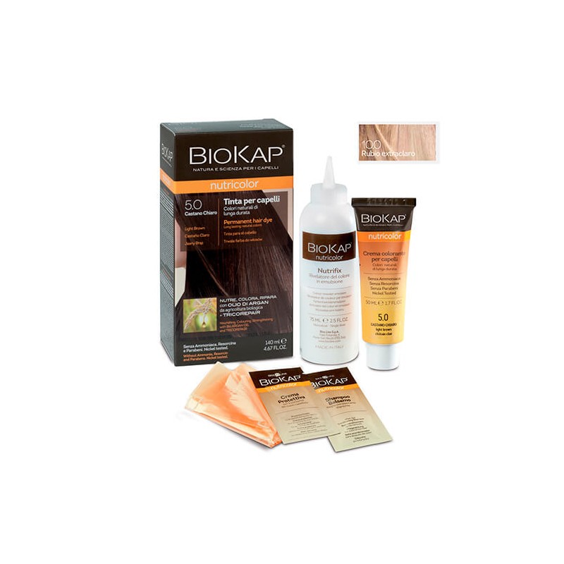 Biokap Nutricolor tinte del pelo es un valioso aliado para la belleza y la coloración del cabello. Su exclusiva fórmula con ingredientes vegetales y alta tolerabilidad de la piel nutre y repara el cabello mientras lo tiñe y cubre perfectamente las canas. Con TRICOREPAIR, un complejo con proteínas del arroz, derivados del sauce y ácidos frutales lipofílicos. Enriquecido con aceite de argán de origen orgánico, nutre el cabello y hace que sea más suave y brillante.
