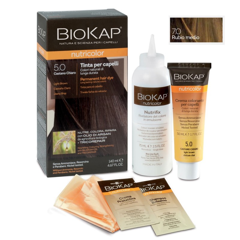 Biokap Nutricolor tinte del pelo es un valioso aliado para la belleza y la coloración del cabello. Su exclusiva fórmula con ingredientes vegetales y alta tolerabilidad de la piel nutre y repara el cabello mientras lo tiñe y cubre perfectamente las canas. Con TRICOREPAIR, un complejo con proteínas del arroz, derivados del sauce y ácidos frutales lipofílicos. Enriquecido con aceite de argán de origen orgánico, nutre el cabello y hace que sea más suave y brillante.
