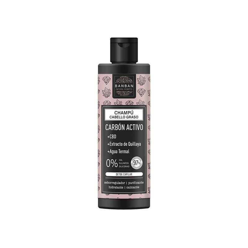 ¿Pelo Graso? ¿Descamación? ¿Picores? ¿Irritación? ¡Este es tu champú ideal! Con más del 97% de ingredientes de origen natural, y libre de sal, sulfatos y siliconas, hace que este champú natural con Carbón activo, CBD, extracto de Quillaya, extracto de Kiwi y Agua termal, entre otros, sea tu gran aliado para tener un cabello sano, fuerte, brillante y libre de grasa. Los activos naturales de este champú penetran en tu cuero cabelludo con una misión: eliminar profundamente la suciedad y las impurezas del cuero cabelludo, limpiando la acumulación que se crea en los folículos y que puede causar descamación, picor e irritación, consiguiendo que luzca fuerte, sano, brillante, y libre de grasa. Además, el cuero cabelludo estará más limpio, fresco y revitalizado. ¡Luce un pelazo BanBan!