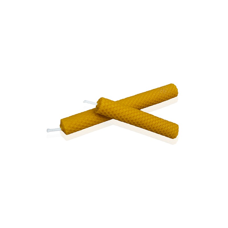 Vela elaborada artesanalmente con láminas de cera de abeja 100% natural, sin parafinas ni otros productos químicos.