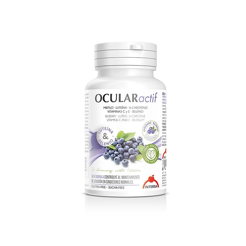Concentrado de jugo de fruto mirtilo (vaccinium myrtillus L); vitamina C; luteína; levadura de cerveza enriquecida en selenio (saccharomyces cerevisiae meyer ex E.C hanse); betacaroteno; vitamina E. Excipiente: almidón de maíz (agente de carga); silice hidratada (antiaglomerante); estearato de magnesio (antiaglomerante).