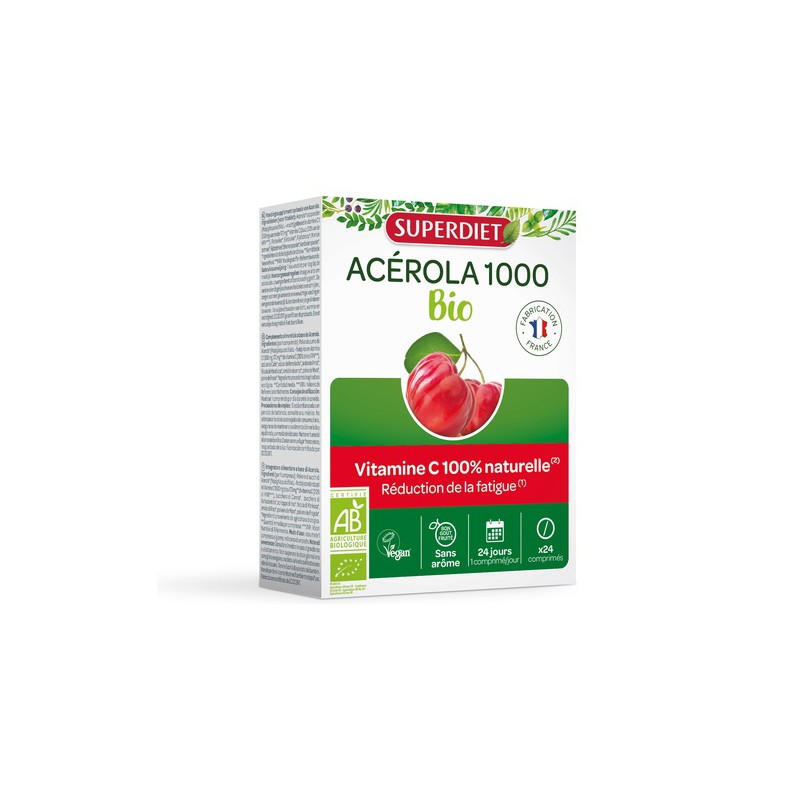 Extracto seco de Acérola* (Malpaghia punicifolia) (1 000 mg** de los cuales 170 mg = 212% de las VRN*** de vitamina C), Azúcar de caña*, maltodextrina*, antiaglomerante: carbonato de magnesio, arome natural, antiaglomerante: silicio, extracto de limón* (Citrus limón) (soportes: maltodextrina*, goma de acacia).