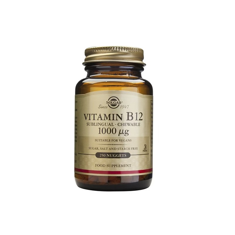 Vitamina B12 en comprimidos sublinguales-masticables de Solgar® aporta, por comprimido, 1000 μg de la forma de vitamina B12 cianocobalamina. Entre otras funciones, la vitamina B12 interviene en la producción de energía a partir de los alimentos, en el funcionamiento del sistema inmunitario y el sistema nervioso y en la formación de glóbulos rojos. La vitamina B12, una vitamina hidrosoluble, se encuentra de forma natural en los alimentos de origen animal, como el pescado, la carne, productos lácteos y huevos. Este nutriente no puede ser producido por el organismo y debe ser ingerido a través de la dieta. Por ello, es especialmente interesante en aquellas situaciones en la que su absorción está disminuida o para personas que siguen una dieta restringida en este nutriente, como la dieta vegana.