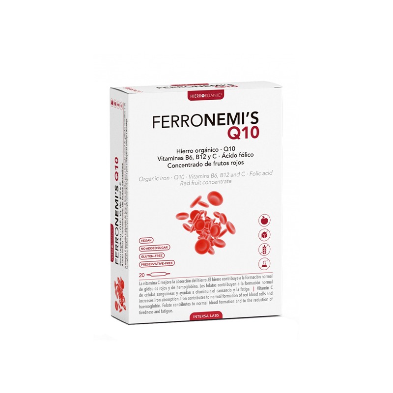 Hierro orgánico + vitaminas c, b6, b12 + ácido fólico + coenzima q10. El hierro contribuye a la formación normal de glóbulos rojos y de hemoglobina. Los folatos contribuyen a la formación normal de células sanguíneas y ayudan a disminuir el cansancio y la fatiga. La vitamina c mejora la absorción del hierro.